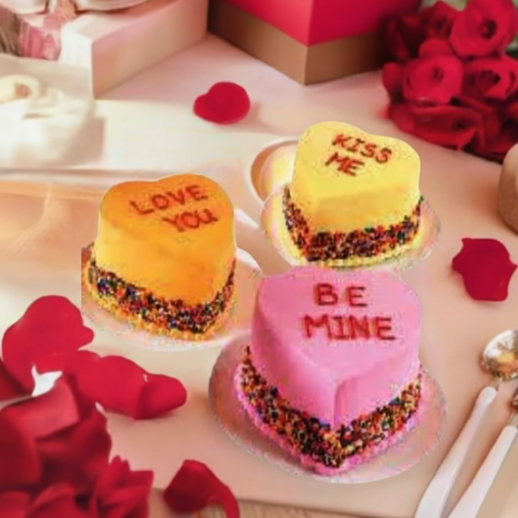 Surprise your loved one with this adorable set of three heart-shaped cakes, each bearing a sweet message: "Kiss Me, Be Mine, Love You." Perfect for any special occasion, this charming combo is sure to bring a smile to their face. Enjoy free delivery across major cities in India. Kindly share your personalised message, delivery date, and preferred time during checkout. Please place orders at least 12 business hours in advance. For any questions, our support team is just a call or WhatsApp away at +918790604818. Make your special moment unforgettable with this lovely
