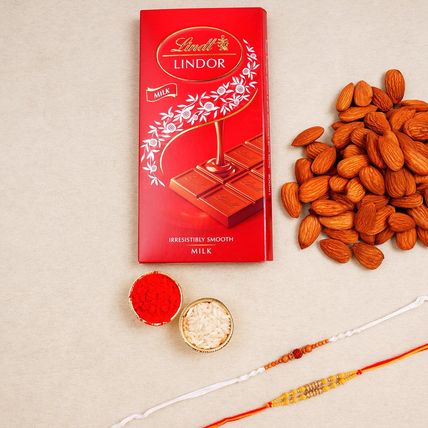 2 RAKHI BRACELET 1 LINDT MILK CHOCOLATE BAR 100 GM 1 ALMOND NUTS 100 GM 1 SET OF COMPLIMENTARY ROLI CHAVAL (TILAK) Important Information: This item is only for shipping in the UK. The user should carefully read the description of gifts, shipping declaration, and destination information before placing the order. The Product shown in the Image may vary in shape or design as per the availability. Upon receiving the edibles, immediately refrigerate them. We ship this item from London by using Royal mail Post or local Courier, Tracking number will be available. Orders received after 2:00 p.m. (UK TIME ZONE) will ship the next working day or later if things out of control. Orders received after 2:00 p.m. Friday or orders received over the weekend are processed on Monday (Unless a public holiday coincides) and a regular delivery schedule will apply. If the Recipient is not at home to receive the product, Postman/courier man may choose to leave the product at the post box, door, or leave a calling card to contact the courier company and arrange re-delivery or pickup. We are unable to call the courier company on behalf of the recipient. We use highly reputable Third party courier companies and will make every effort to deliver on time. however, occasionally delays are possible which is out of our control. We do not accept responsibility for Third party Post/Courier delays lost or damaged and the delivery charges or the products are non-refundable, even thought we have offer Free shipping. All charges have included in the final price. Please refer to our Terms & Conditions for more information.