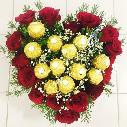 Order a Heart-shaped Bouquet of Red Roses and Ferrero Rocher Chocolates for birthdays or anniversaries in India. Reliable delivery to all cities across India.