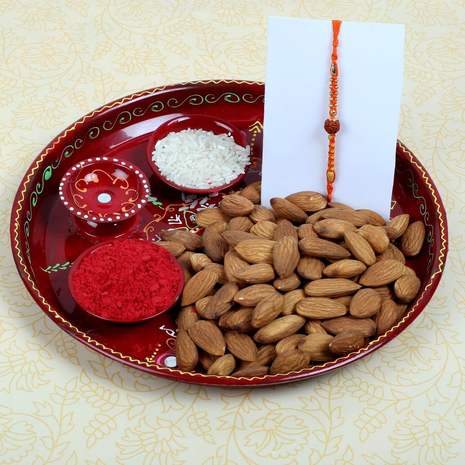 1 RAKHI BRACELET 1 PUJA THALI 1 ALMOND NUTS 100 GM 1 SET OF COMPLIMENTARY ROLI CHAVAL (TILAK) Important Information: This item is only for shipping in Europe. The user should carefully read the description of gifts, shipping declaration and destination information before placing the order. The Product shown in the Image may vary in shape or design as per the availability. Upon receiving the edibles, immediately refrigerate them. We ship this item from London by using Royal mail Post or local Courier, Tracking number will be available. Orders received after 2:00 p.m. (Europe TIME) we will ship next working day. Orders received after 2:00 p.m. Friday or orders received over the weekend are processed on Monday (Unless a public holiday coincides) and regular delivery schedule will apply. If the Recipient is NOT AT HOME to receive the product, Postman/courier man may choose to leave the product at the post box, door or leave a calling card to contact the courier company and arrange re-delivery or pickup. We use highly reputable Third party courier companies and will make every effort to delivery date, however occasionally delays are possible which is out of our control. We do not accept responsibility for Third party Post/Courier delays lost or damaged and the delivery charges or the products are non-refundable. Please refer Terms & Conditions for more information.