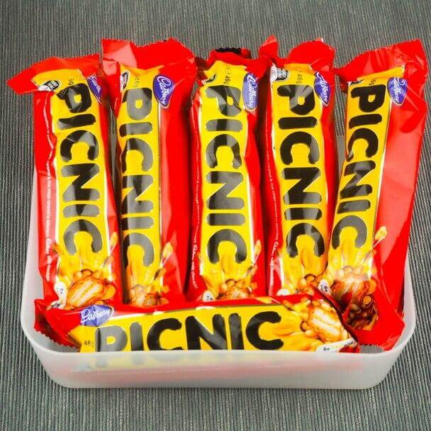 - 6 Picnic Chocolates bars. (Plastic box not included).