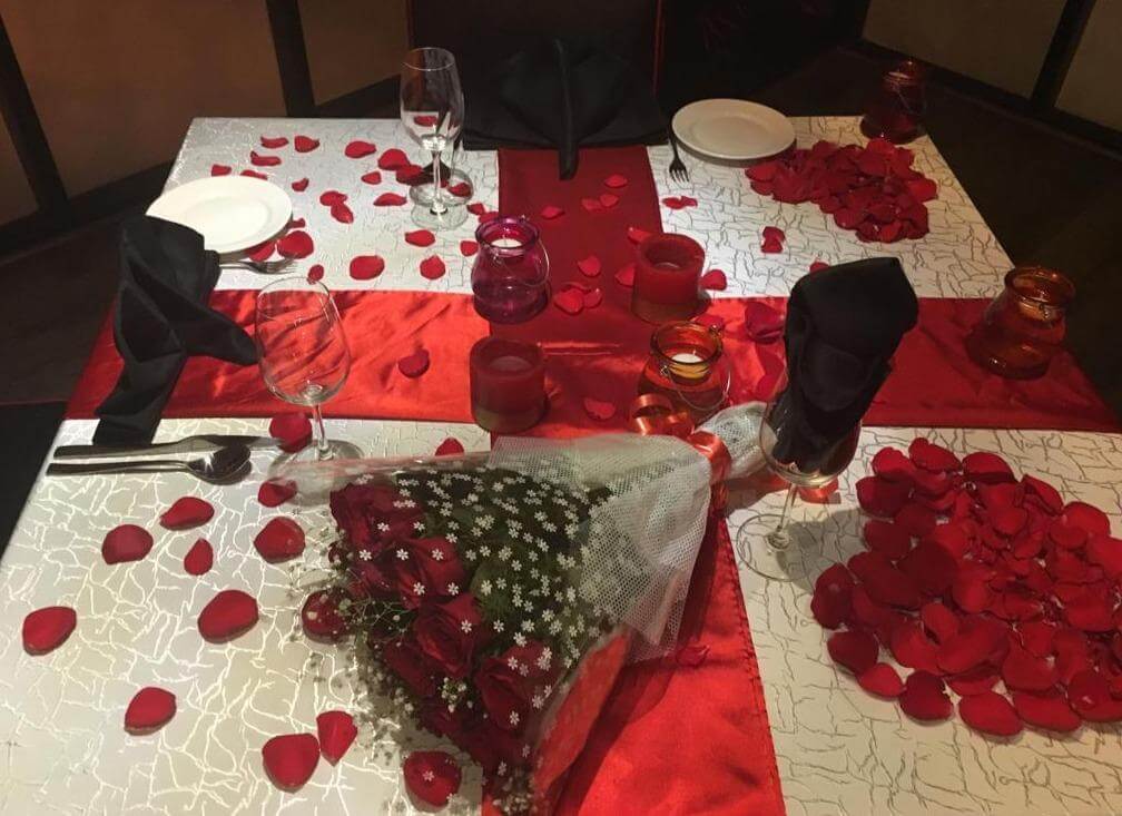 Dinner for 2 + Table Decoration + 500 grams Cake + Flower Bouquet + Mocktails + 4 course meal + Exclusive table set up with candles and rose petals + Special butler service
