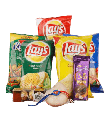 1 Set of Rakhi, and Dairy Milk and Lays packets (4) and Ferrero